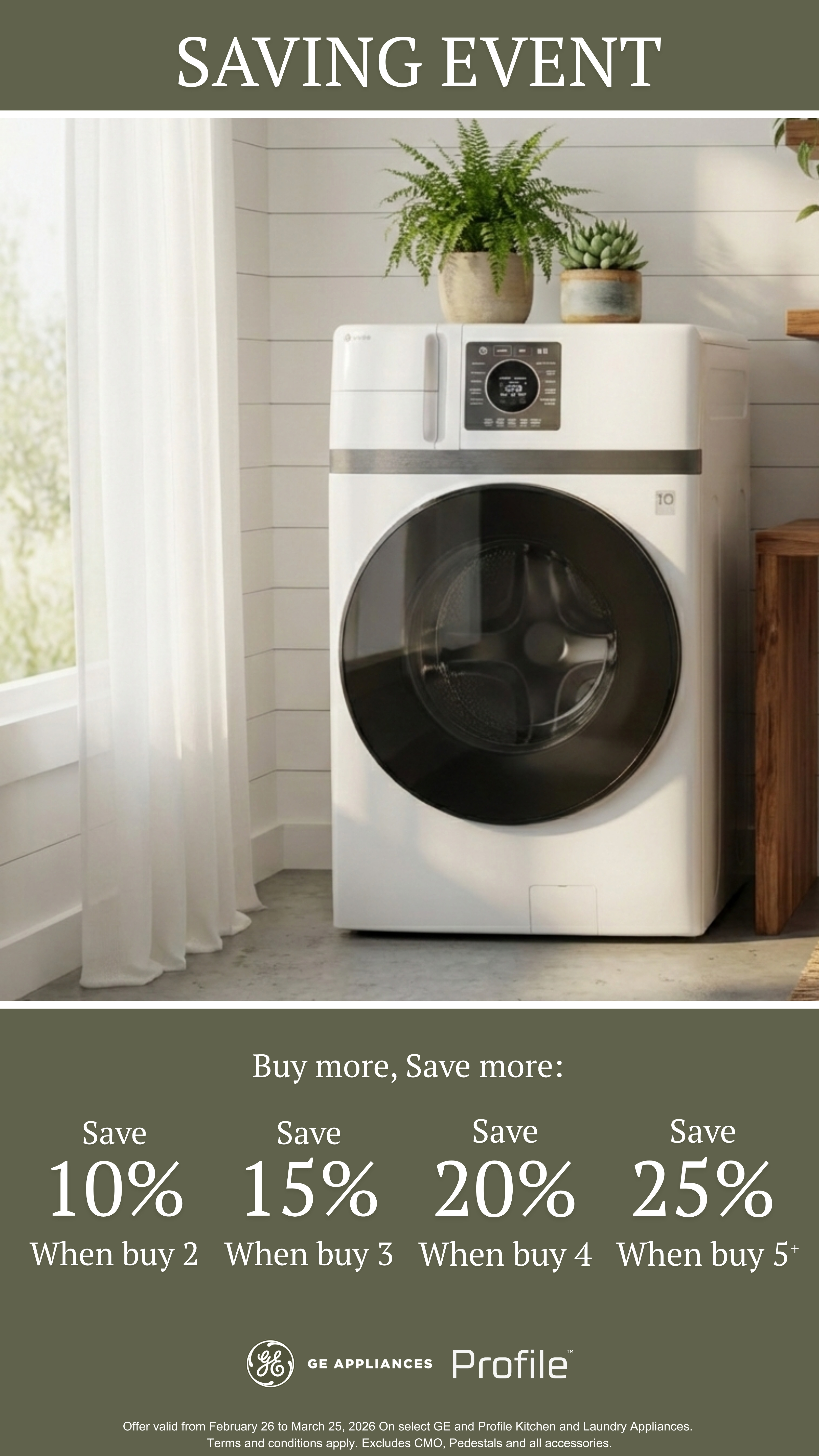 The more you buy, the more you save with GE Appliances and Profile from February 26 to March 25, 2026. Save 10% when you buy 2 eligible appliances. Save 15% when you buy 3 eligible appliances. Save 20% when you buy 4 eligible appliances. Save 25% when you buy 5+ eligible appliances. *Some conditions apply. Promotion is not available for online orders. Promotion cannot be combined with other promotional offers. See in-store or contact your local Goemans Appliances for more details.