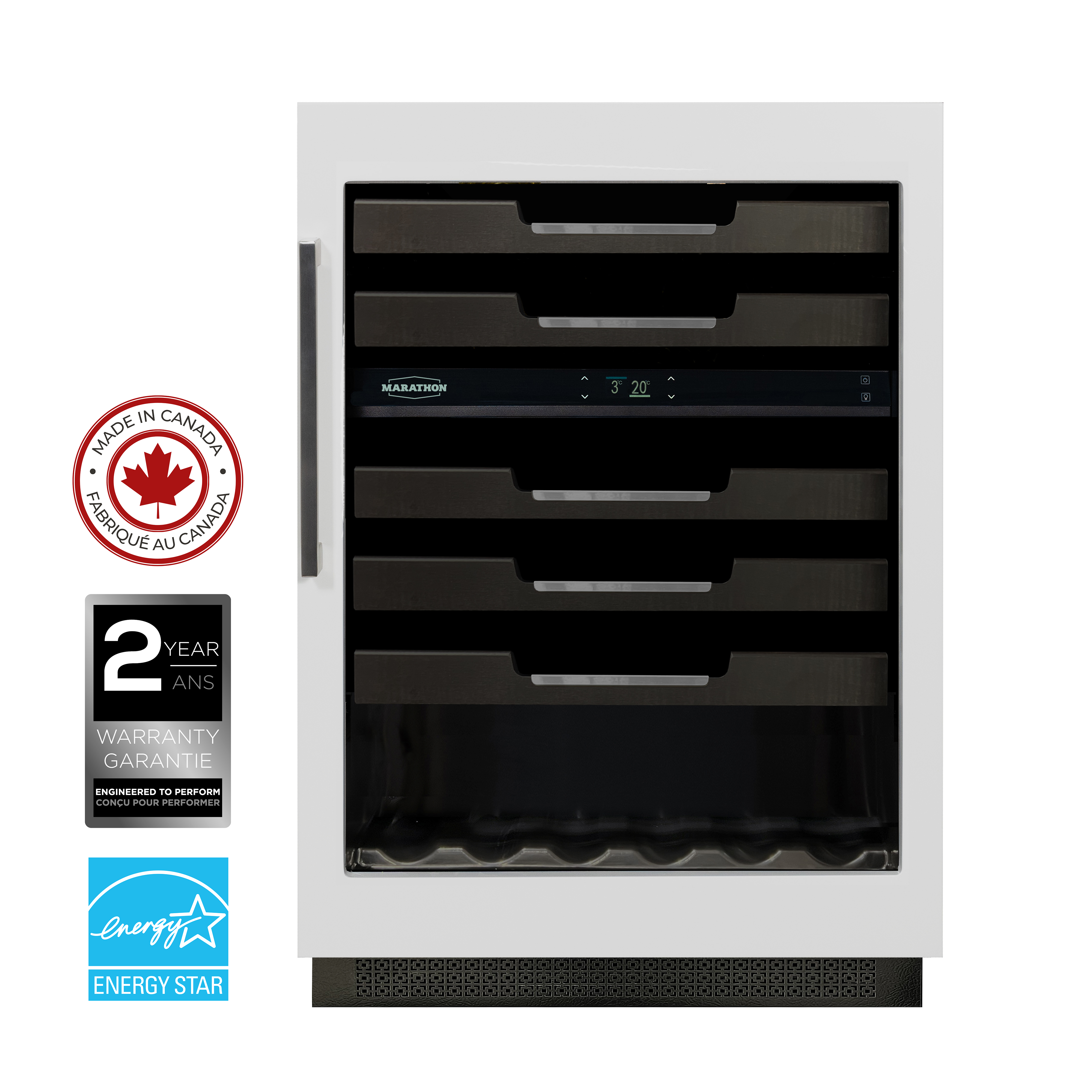 The True North Collection is a celebration of Canadian heritage, inspired by the natural beauty and strength of our landscape. Inspired by the renowned wine region of Brome-Missisquoi in Québec, this Canadian-made dual zone wine cooler brings elegance and precision to wine preservation. With a 52-bottle capacity, it features five handcrafted shelves made from dark-stained Canadian maple, each accented with subtle stainless steel detailing for a refined touch. Dual temperature zones ensure optimal conditions for both red and white wines, while its design reflects the artistry and heritage of Canadian craftsmanship.