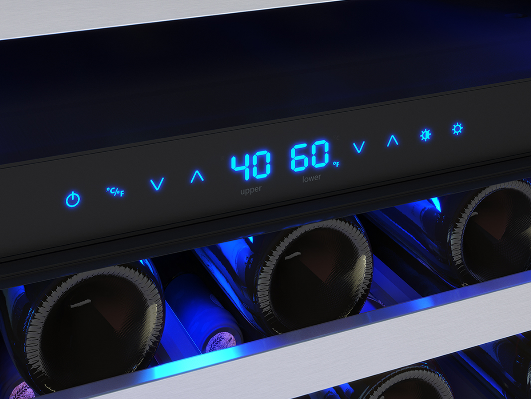 For wines that are twice as nice and no limits on the guest list! Our Presrv Dual Zone Wine Cooler means never having to choose between white or red, and always being ready to pour anyones favorite. This large capacity cooler maintains two distinct temperature zones with PreciseTemp temperature control and includes Active Cooling Technology to ensure even cooling, along with loads of other features from Full-Extension Wood Racks to a Vibration Dampening System. Match the party's vibe with an illuminated control panel and new vertical LED light strips in three colors and four light levels.