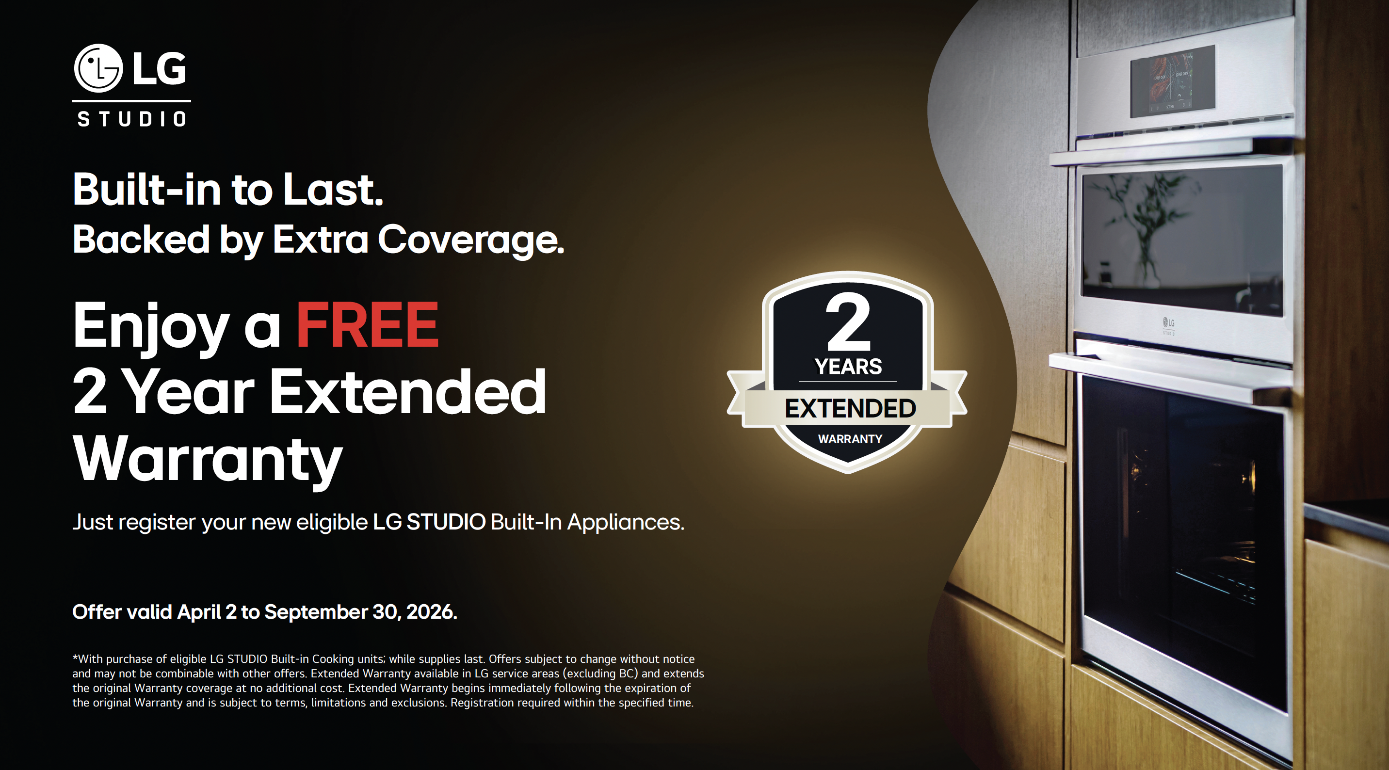 LG Studio products are built-in to last. They want to back you up with extra coverage for your LG Studio purchase. Enjoy a FREE 2-year extended Warranty when you register your new eligible LG Studio Built-In Appliance from April 2 to September 30, 2026. Some conditions apply. Promotion is not available for online orders. Promotion cannot be combined with other Promotional offers. See in-store or contact your local Goemans Appliances for more details.
