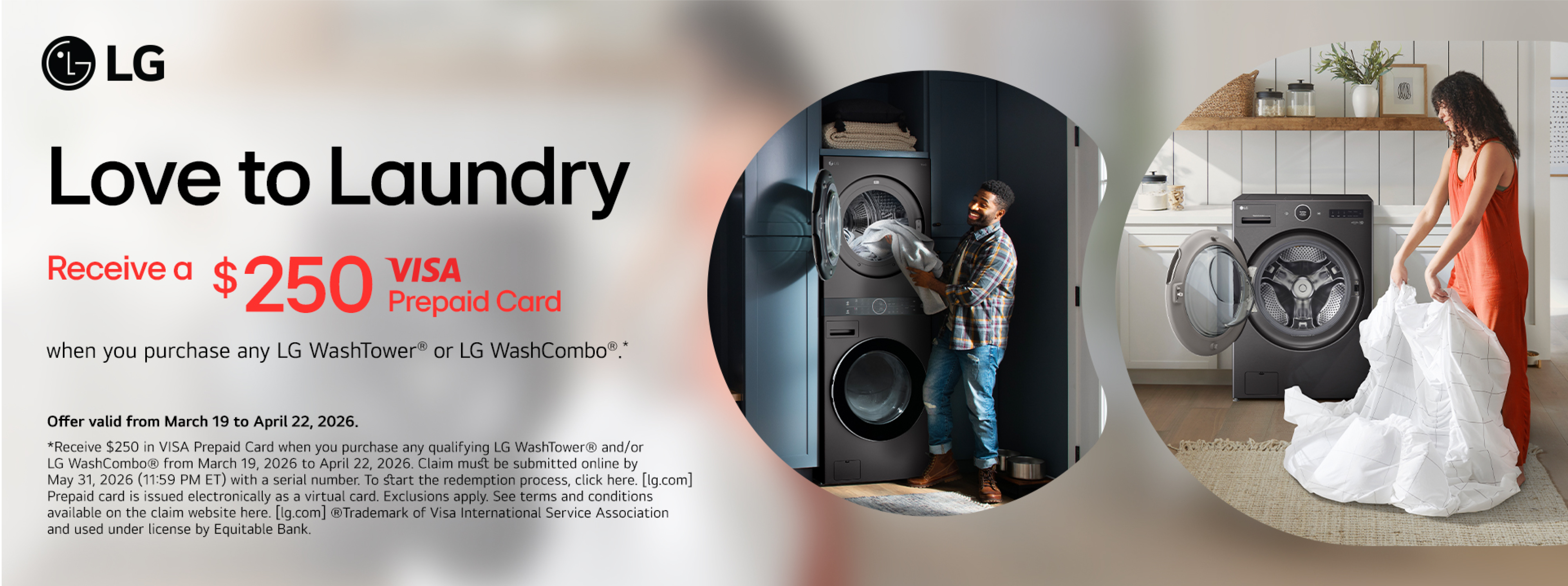LG is helping you to love doing the laundry with their Love To Laundry event. Receive a $250 Visa prepaid card when you purchase any LG Washtower® or LG WashCombo™* from March 19 to April 22, 2026.