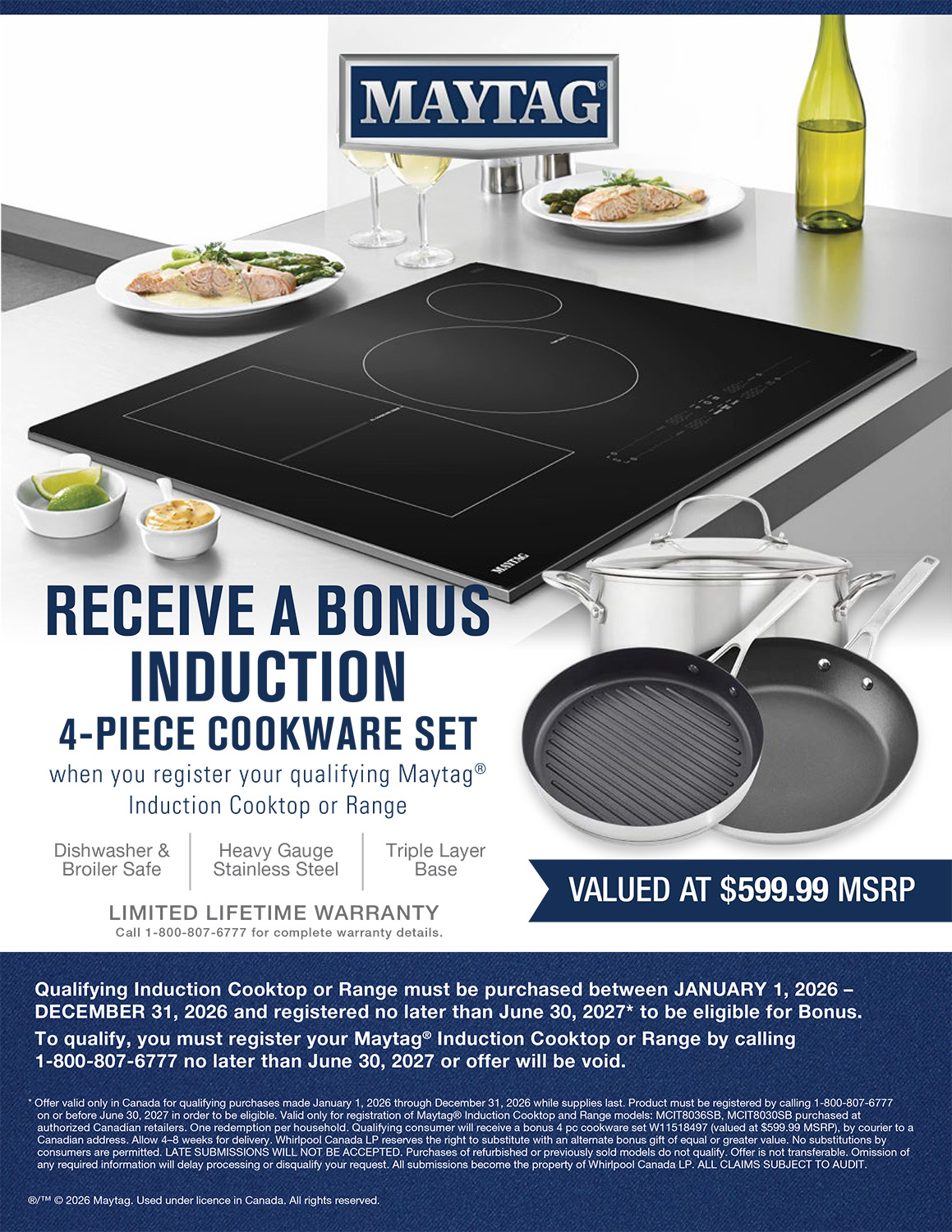 Receive a bonus Induction 4-Piece cookware set when you register your qualifying Maytag induction cooktop or range from January 1 – December 31, 2026. registered no later than June 30, 2027* to be eligible for Bonus. To qualify, you must register your Maytag® Induction Cooktop or Range by calling 1-800-807-6777 no later than June 30, 2027, or the offer will be void. *Some conditions apply. Promotion is not available for online orders. Promotion cannot be combined with other Promotional offers. See in-store or contact your local Goemans Appliances for more details.