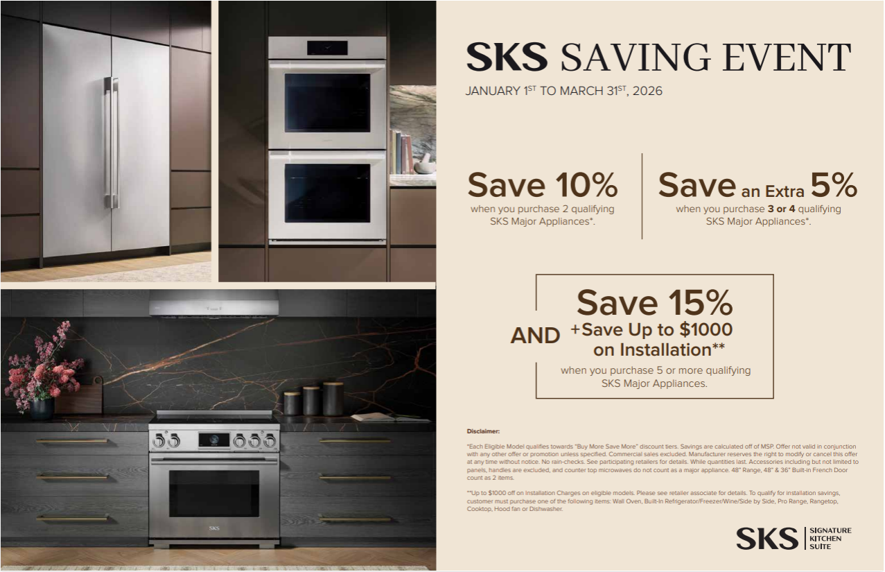 It’s the year of savings with the SKS Saving Event from January 1 – March 31, 2026. The more you buy, the more you save on SKS appliances. Save 10% when you purchase 2 qualifying SKS Major Appliances.* Save an extra 5% when you purchase 3 or 4 qualifying SKS Major Appliances* AND save 15% + Save up to $1000 on installation** when you purchase 5 or more qualifying SKS major appliances. Some conditions apply. Promotion is not available for online orders. Promotion cannot be combined with other Promotional offers. See in-store or contact your local Goemans Appliances for more details.